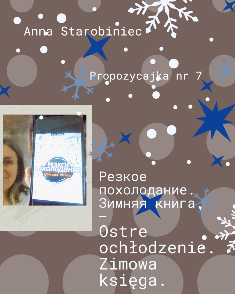 Mamy piękne lato. Upał otula nas szczelnie. Przylepia się do każdego skrawka ciała. A skwar dopiero się zaczyna… W lipcu popadało mocno więc i kwiaty zakwitły. Ich zapach unosi się nawet nad miastami, zwykle przytłoczonymi odorem spalin. Zieleń głęboka, pełna przepychu. W takim letnim anturażu proponuję Państwa uwadze zbiór opowiadań „Ostre ochłodzenie. Zimowa księga.” autorstwa Anny Starobiniec. Pisarkę przedstawiałam już w lutym prezentując jej powieść „Żyjący”. Poświęcam jej kolejną Propozycajkę, gdyż to moja ulubiona współczesna pisarka rosyjska.